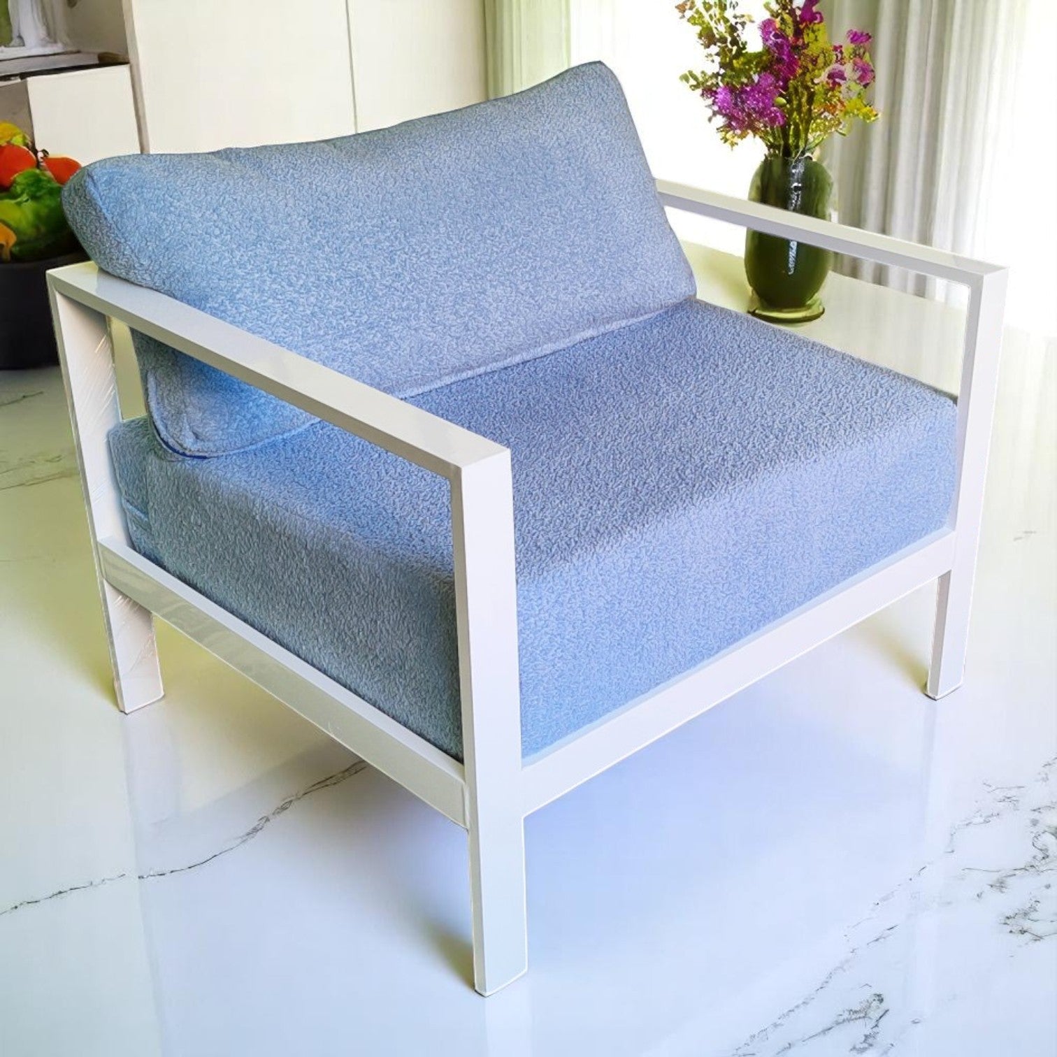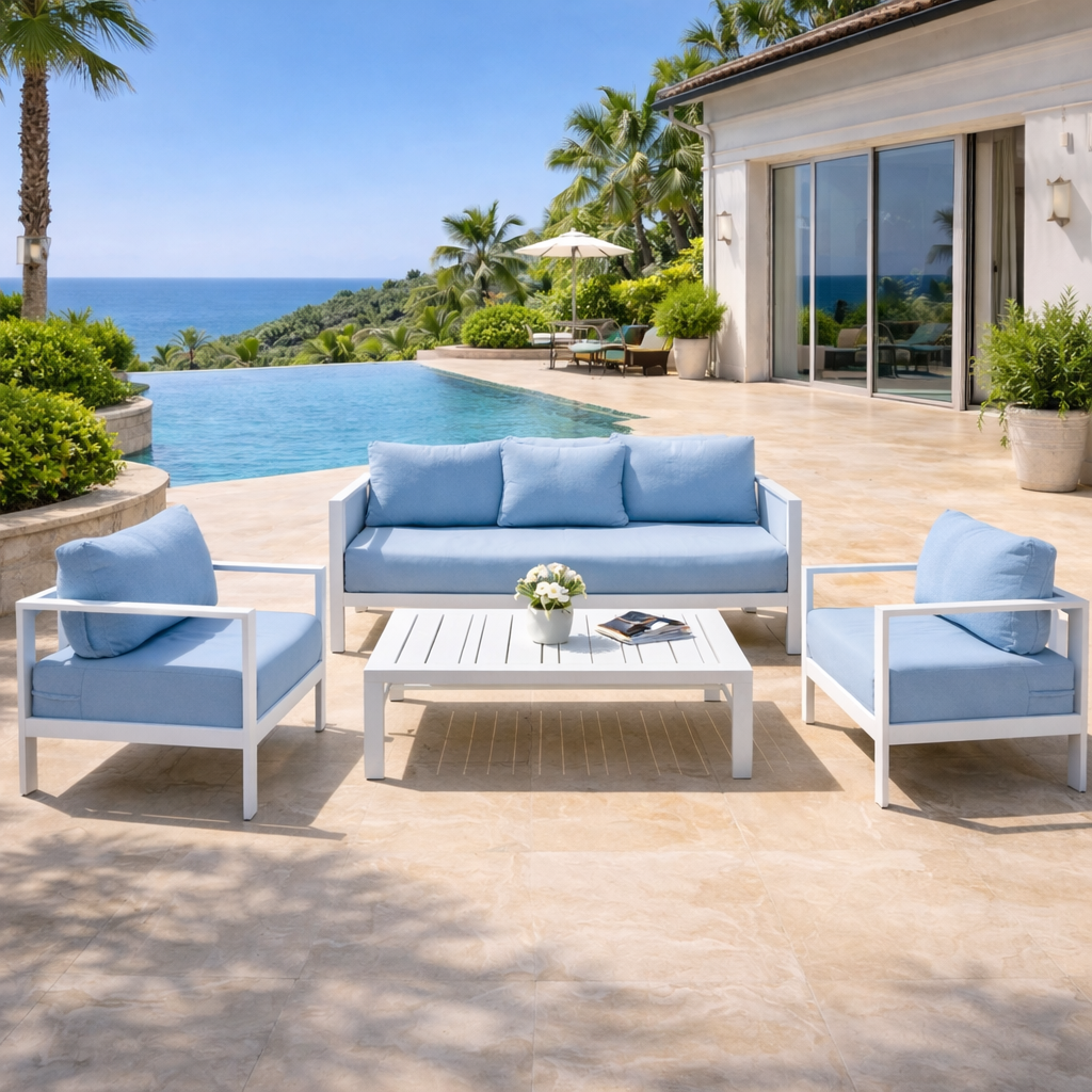ارتقِ بتجربة الجلوس مع طقم آركو — حيث تمتزج الخطوط الانسيابية مع راحة ناعمة ولمّة مريحة. يأتي الطقم بتصميم عصري مينيمالي مكوّن من كنبة لثلاثة أفراد وكرسيين منفصلين، بهيكل من الألومنيوم الأبيض غير القابل للصدأ، ليمنح أي مساحة شكل أنيق وراحة تدوم.