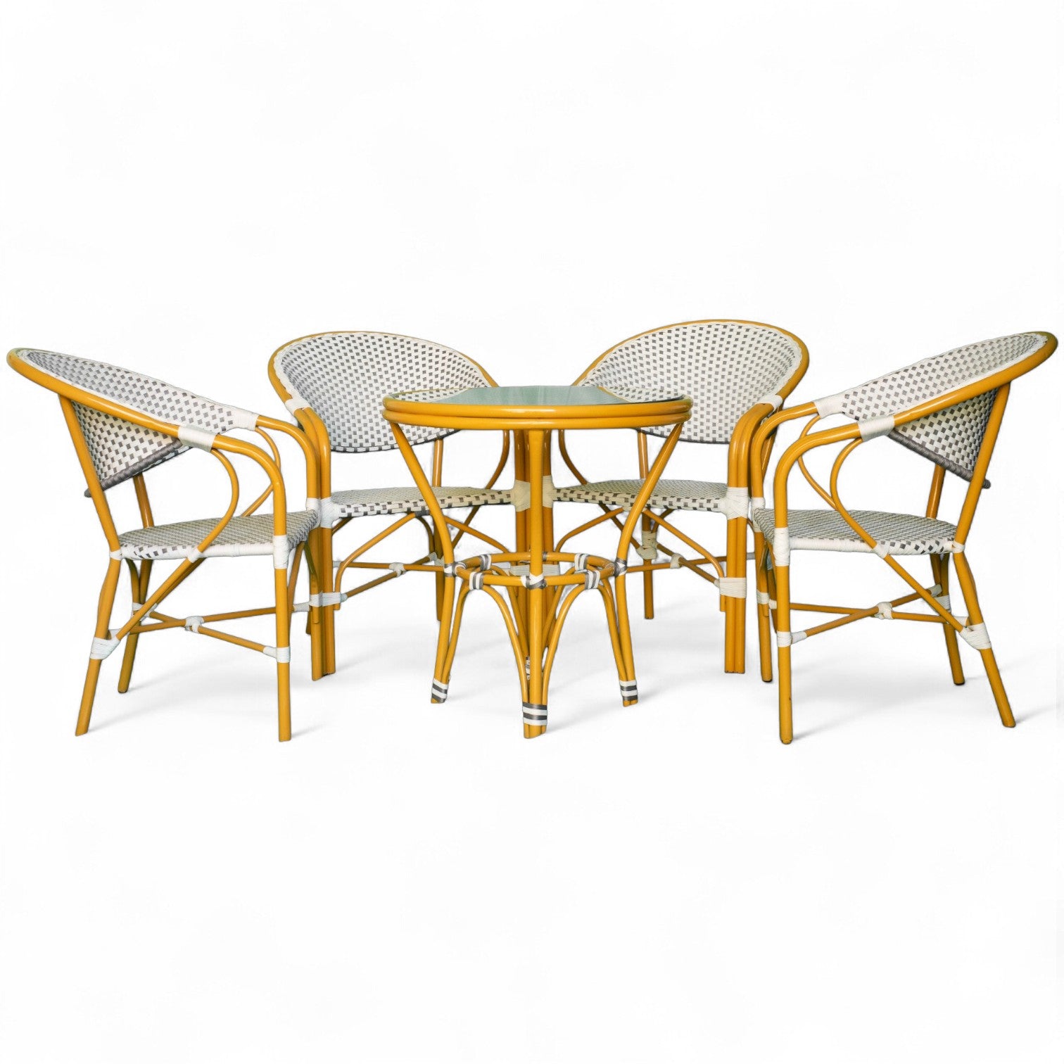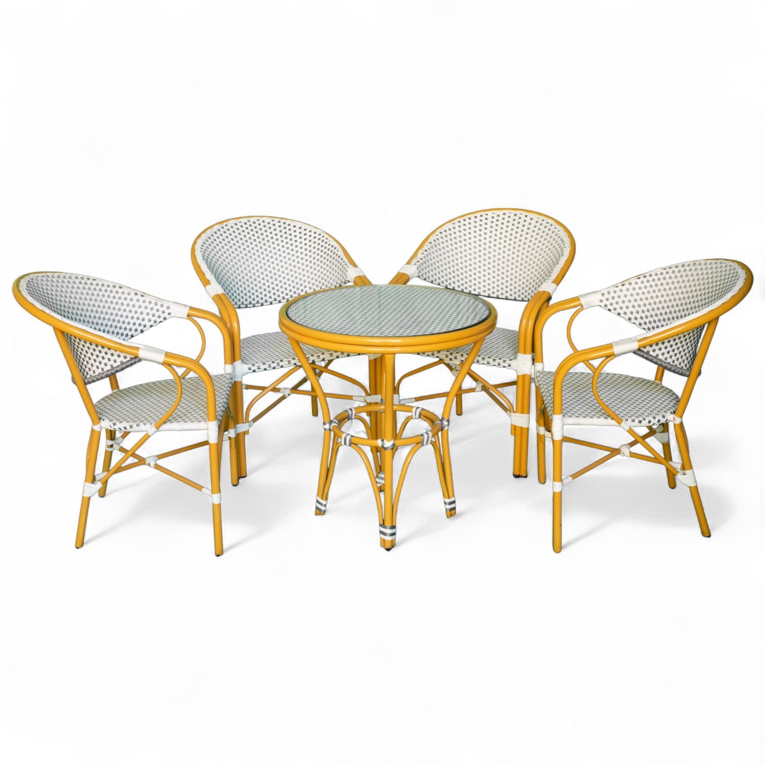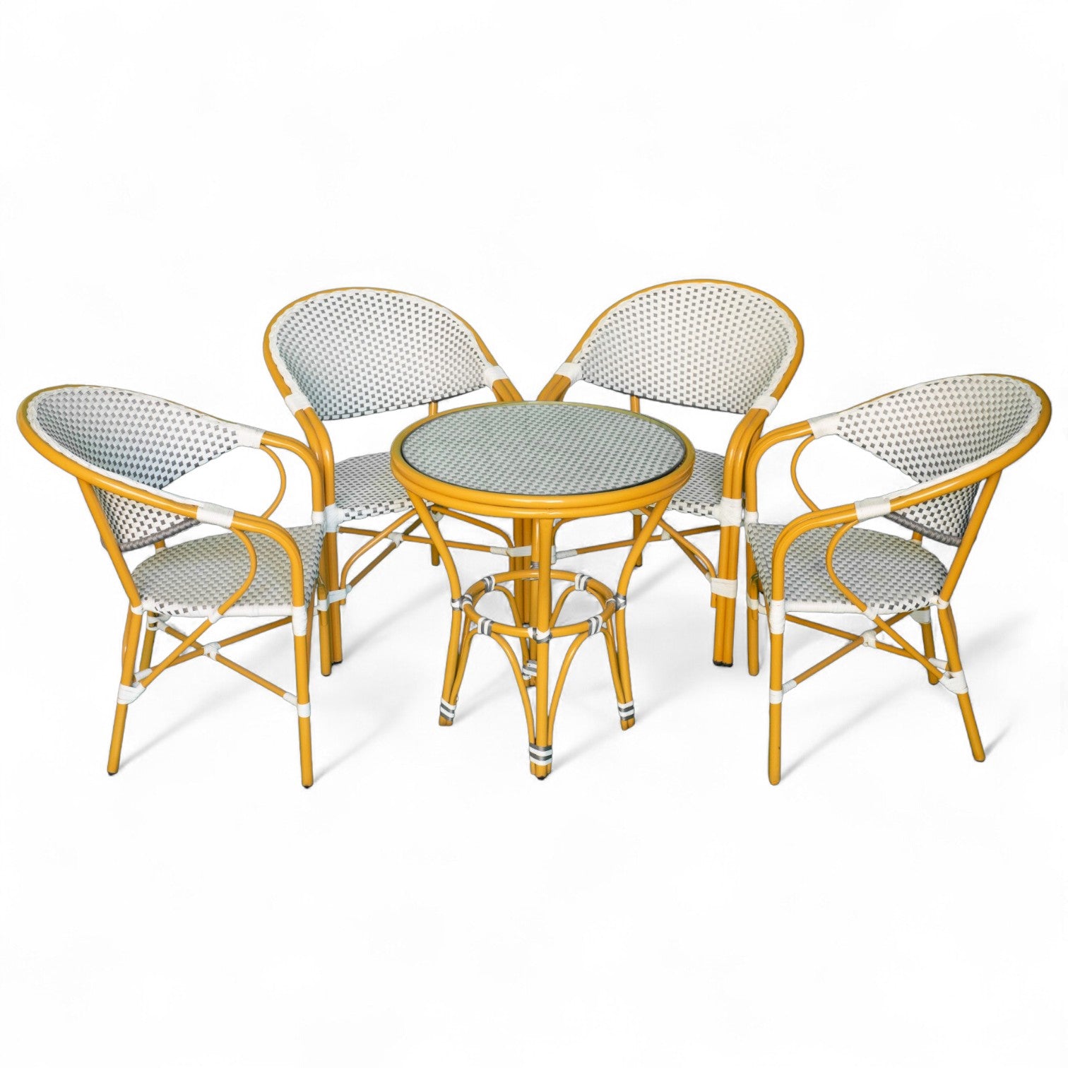 لو بتدور على طقم سفرة شيك وصغير يكمّل شكل البلكونة أو الجنينه، طقم RiO هو الاختيار المثالي. تصميم عصري بسيط، ترابيزة مدورة وأربع كراسي بظهر ومسند، كلها متجدلة يدوي من رتان صناعي قوي يتحمّل الشمس والمطر.