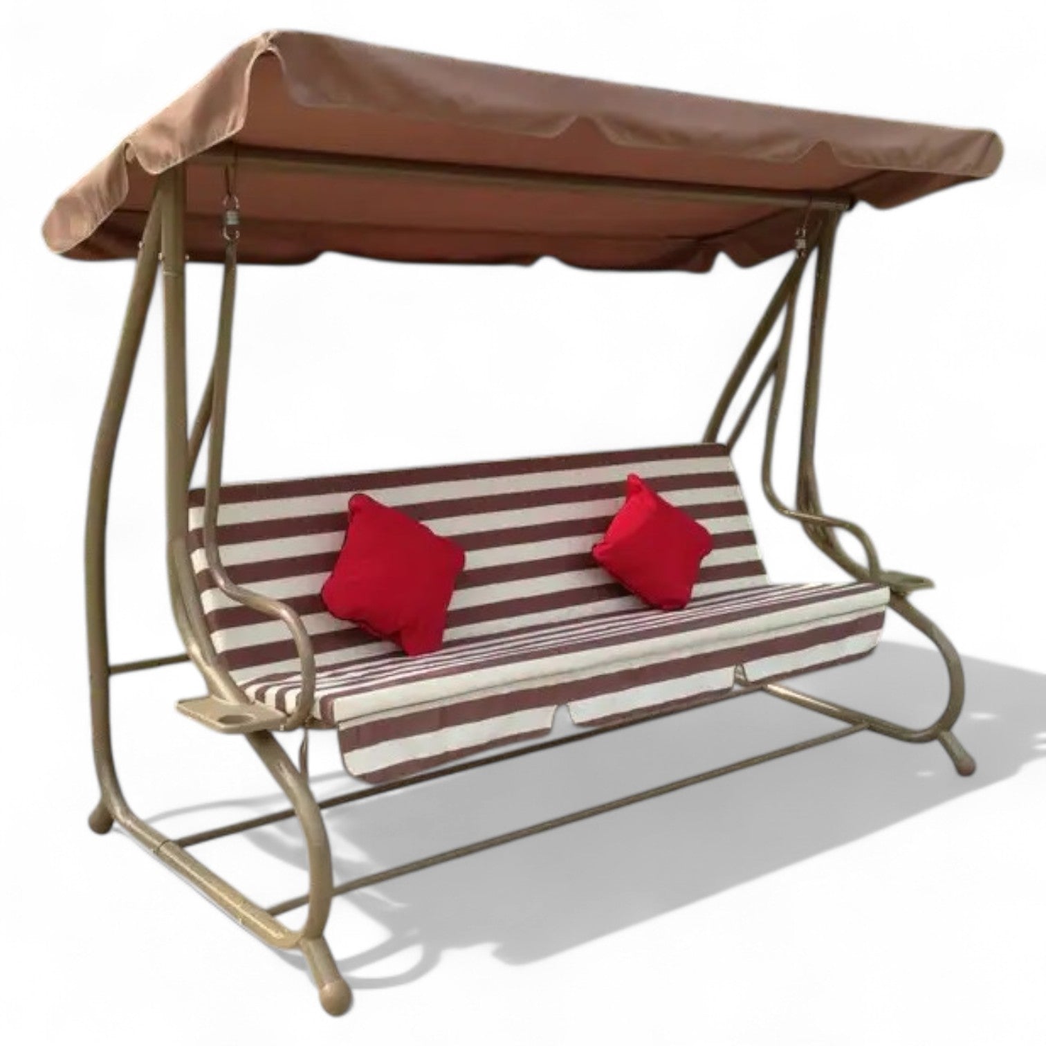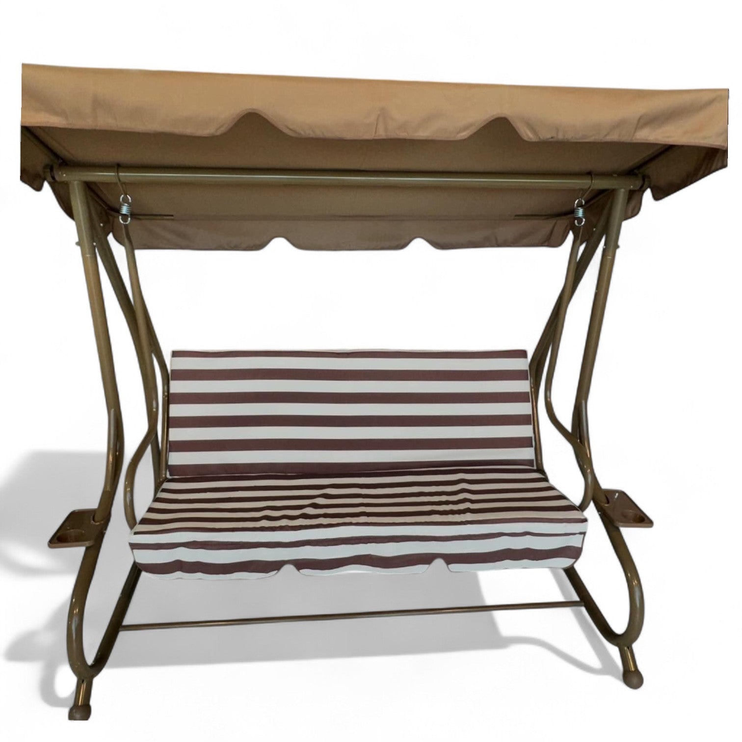استمتع بهزّة هادية وجو مريح مع أرجوحة بريز. مصممة بهيكل ستيل قوي مطلي ضد الصدأ، ومعاها تندة مقاومة لأشعة الشمس والمية علشان تحميك وتخليك قاعد براحتك في الظل. القماش المخطط بالأخضر والأبيض بيديها شكل كلاسيكي أنيق، وبيخليها إضافة مميزة لأي جنينة، بلكونة، أو تراس.