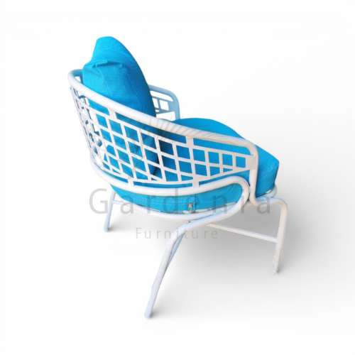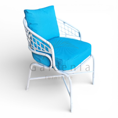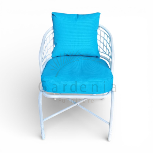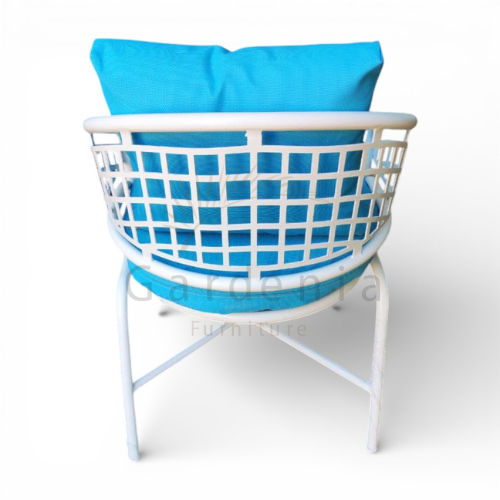 الكرسي مصنوع من هيكل ألومنيوم خفيف ومتين، مقاوم للصدأ ومصمم يتحمل الاستخدام الخارجي لفترات طويلة. مطلي بدهان إليكتروستاتيك بيور بوليستر معالج بلون أوف وايت ناعم، مقاوم للشمس والرطوبة والعوامل الجوية المختلفة مع ثبات عالي في اللون.