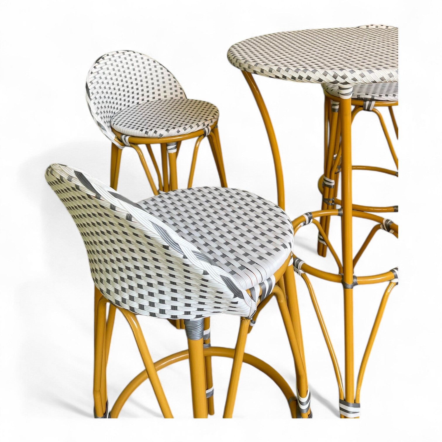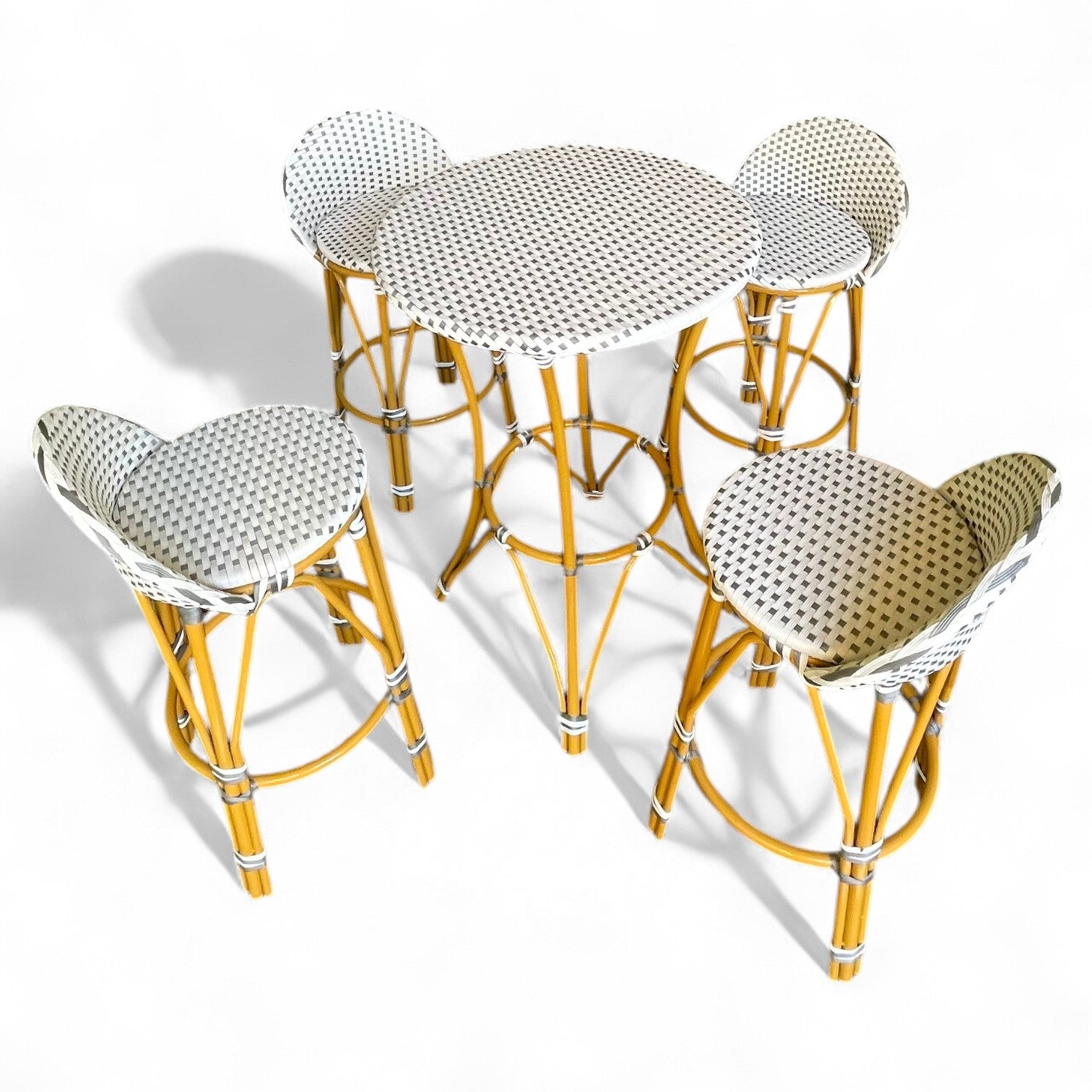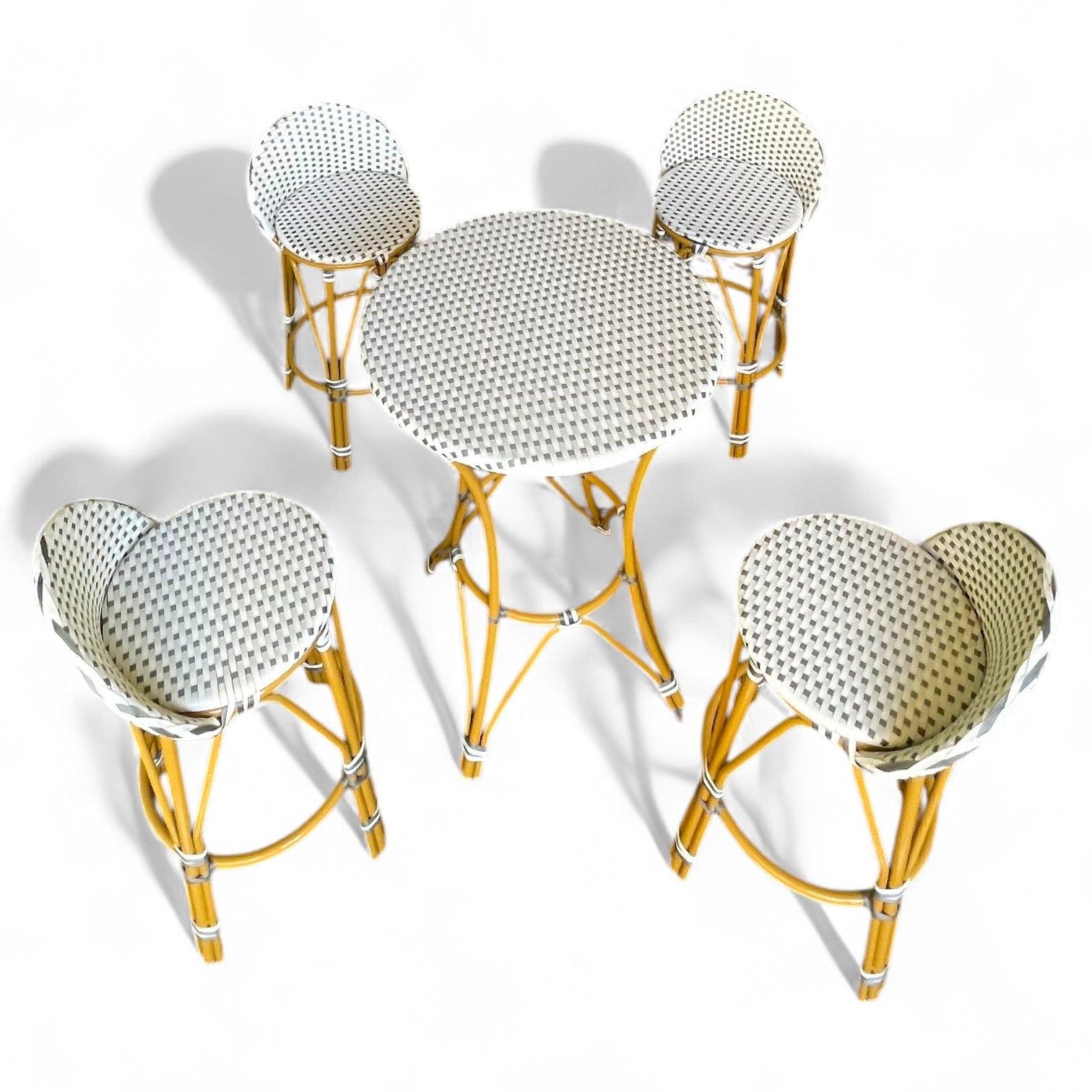 لو بتحب الجو الأوروبي الرايق، طقم Bistro Charm هيحول أي مكان مفتوح لكورنر قهوة شيك. الترابيزة العالية المستديرة وأربع كراسي بار متجدلين يدوي برتان صناعي متين، مع هيكل خفيف شبه البامبو من المعدن – كله معمول ليخدم الشكل والراحة.