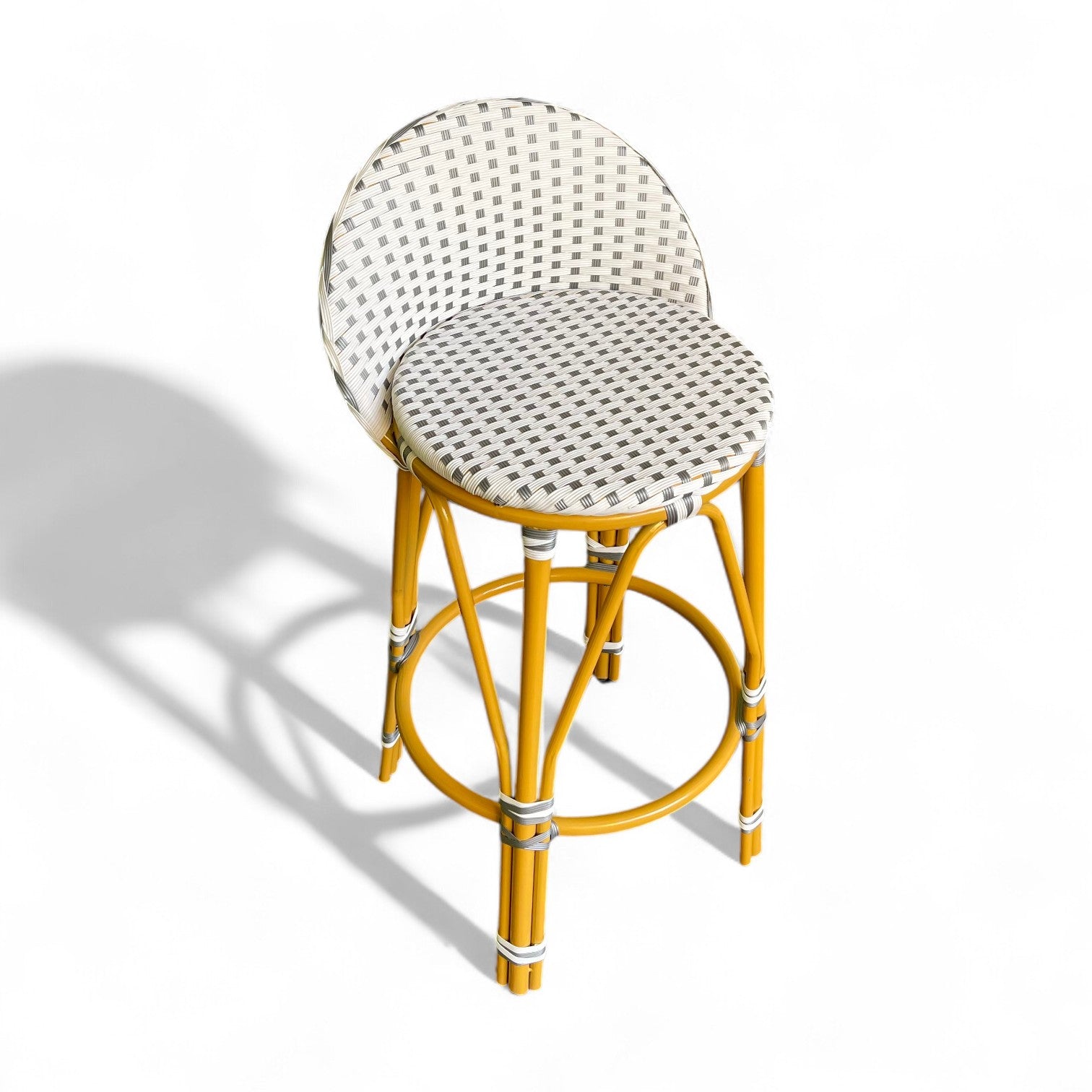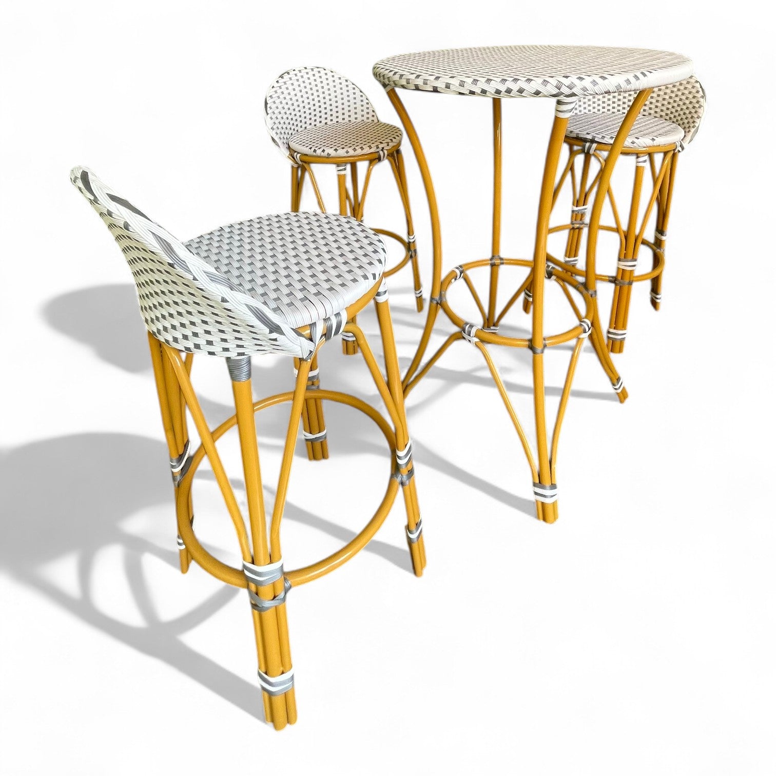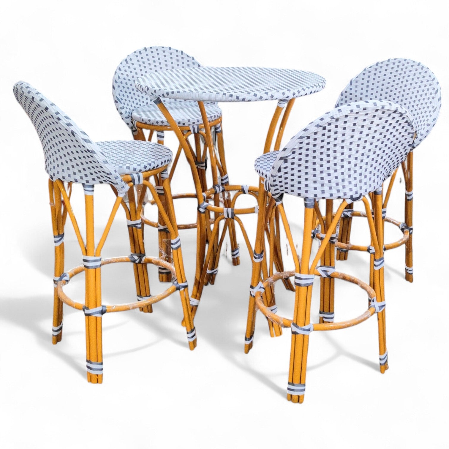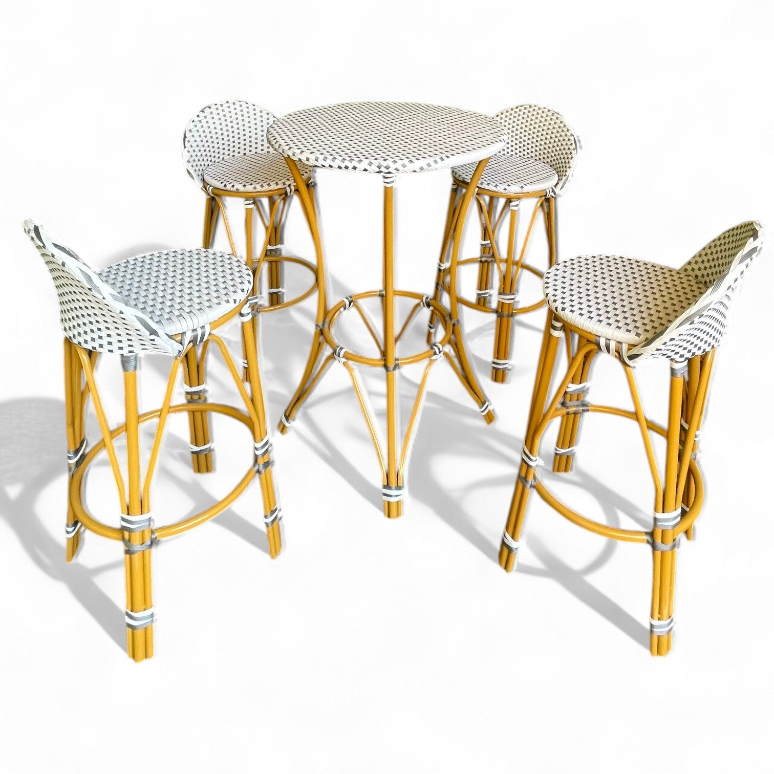 لو بتحب الجو الأوروبي الرايق، طقم Bistro Charm هيحول أي مكان مفتوح لكورنر قهوة شيك. الترابيزة العالية المستديرة وأربع كراسي بار متجدلين يدوي برتان صناعي متين، مع هيكل خفيف شبه البامبو من المعدن – كله معمول ليخدم الشكل والراحة.