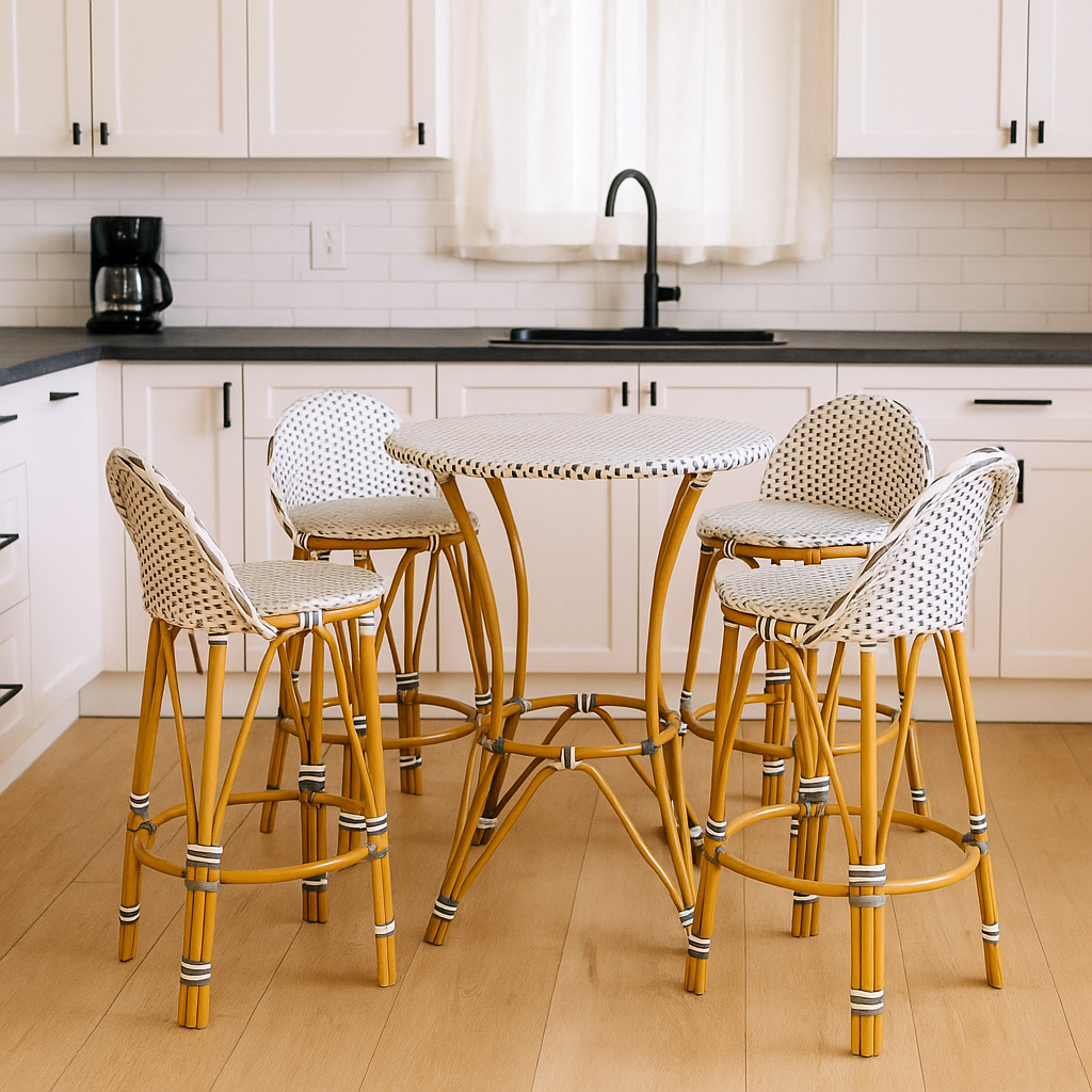 Bring the charm of a Parisian café to your space with the Bistro Charm Set. This set features a high round table and four elevated chairs, all hand-woven with durable synthetic rattan and supported by a bamboo-look aluminum frame—perfect for stylish, cozy coffee moments.