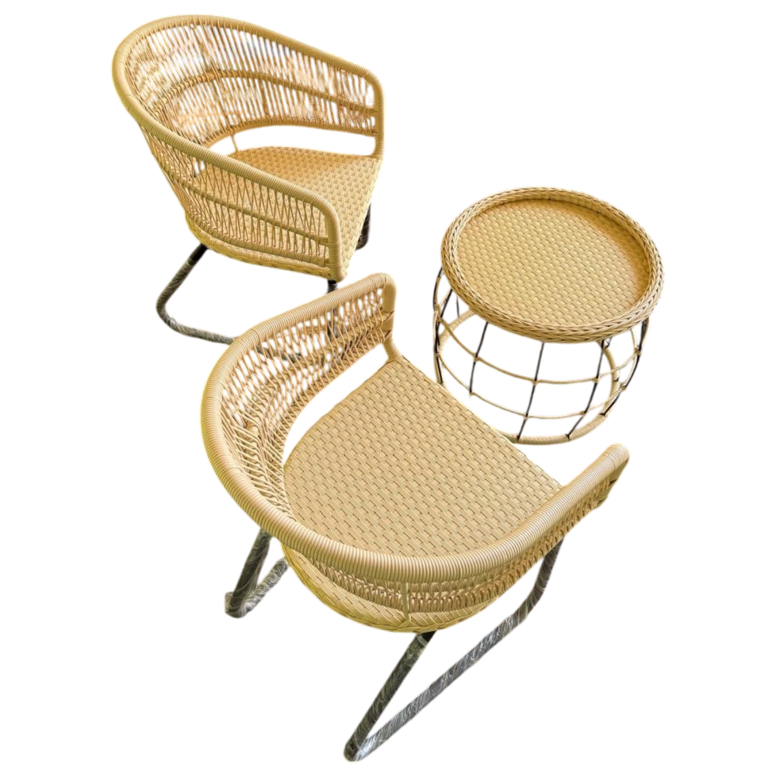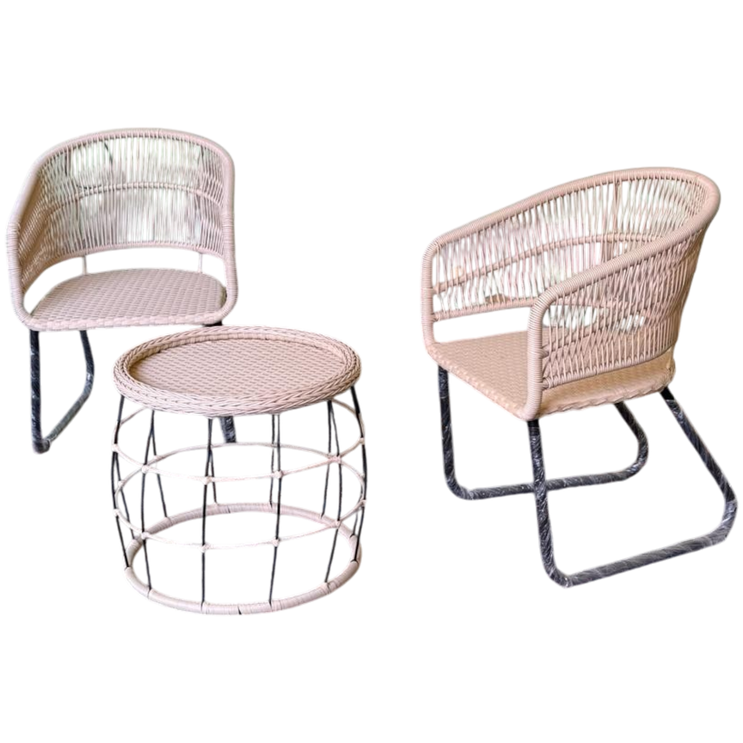 دلّع ركن الاسترخاء في بيتك أو بلكونتك مع طقم ريفان المكوّن من 2 كرسي واسع الظهر + ترابيزة دائرية أنيقة. تصميم عصري مصنوع يدويًا من رتان صناعي فاخر وهيكل معدن مطلي ضد الصدأ. مناسب للمساحات الخارجية والداخلية بطابع بوهيمي بسيط.