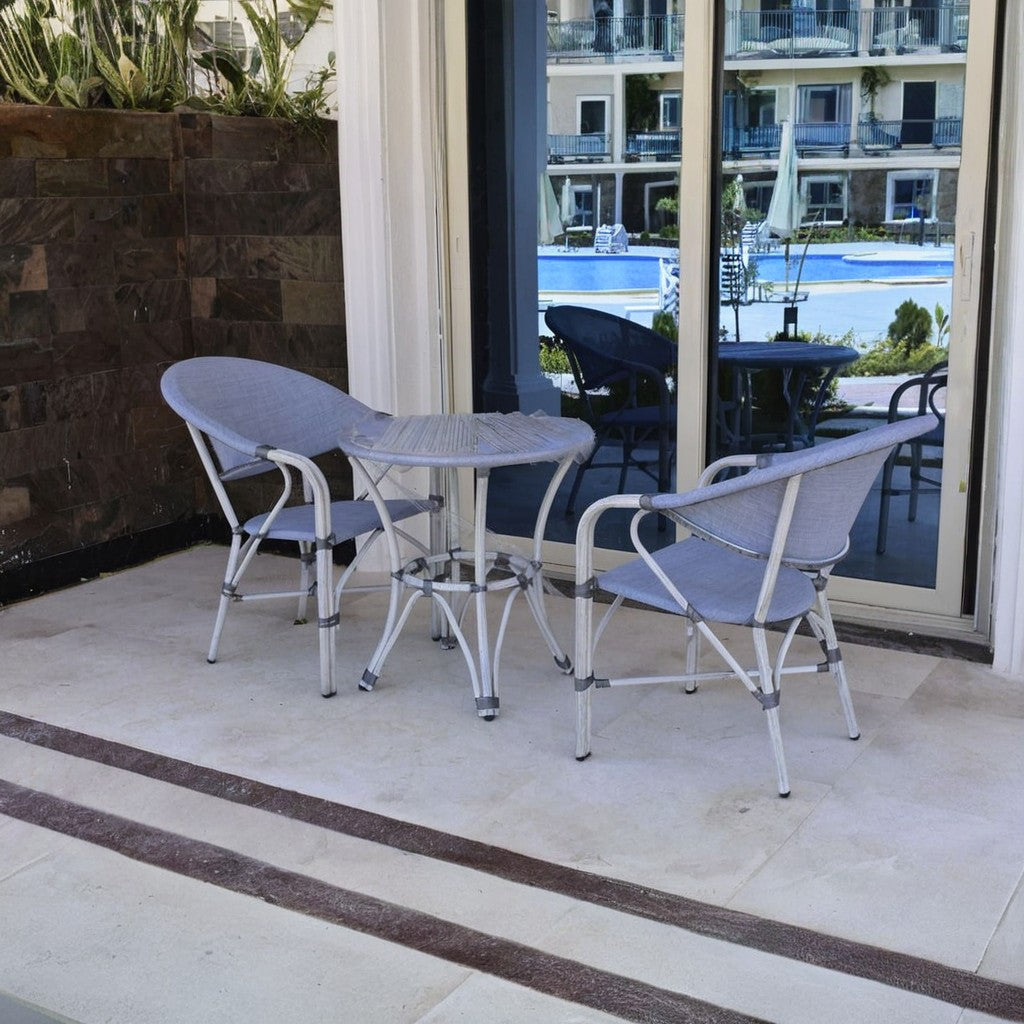 تمتع بتصميم يجمع بين العملية والجمال مع طقم ريو المكوّن من 2 كرسي + ترابيزة صغيرة. الكراسي مصنوعة من هيكل معدني قوي ومقعد من قماش PVC Mesh عالي التهوية، مع ترابيزة متينة بنفس الأسلوب البسيط. مثالي للحدائق، البلكونات، أو الاستخدام التجاري في الكافيهات والمطاعم.